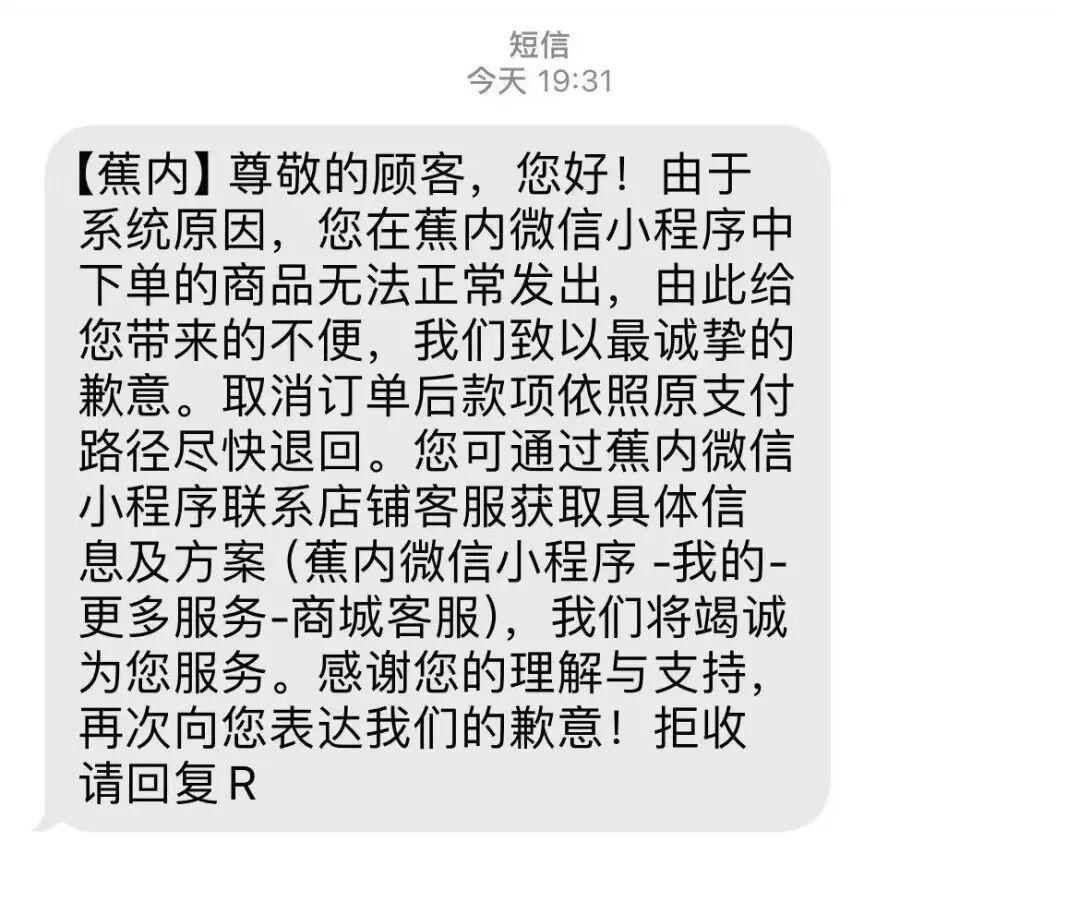 据多位消耗者发布的图片,蕉内给消耗者发送的短信显现:“由于系统原因,您在小花样中下单的商品无法浅薄发出,由此给您带来的未便,咱们致以最忠实的歉意。取消订单后款项依照原支付旅途尽快清偿。”